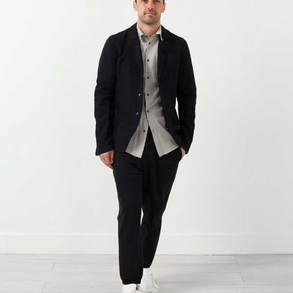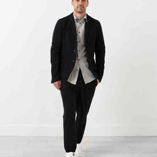 The Frimel Jacket is comfortable, lightweight, with just the right amount of casual. Snap button closure at front. Three exterior pockets, two interior pockets. Lined. Hannes Roether. Color Black. 51% Linen, 49% Cotton. Made in the EU. Jacob is wearing a Small.