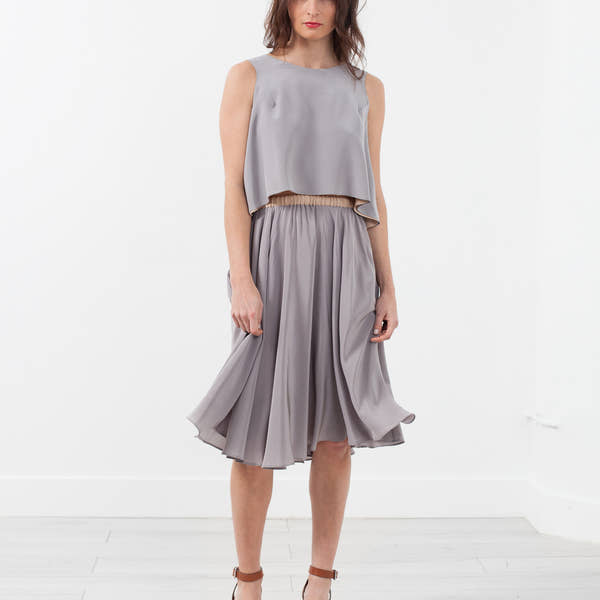 Silk-like sensuality is demonstrated in the Full Skirt by Louiza Babouryan. Elastic waistband for ease. Knee length A-line circle skirt. Color Grey. 100% Silk. Made in U.S.A. Lana is wearing an X-Small.