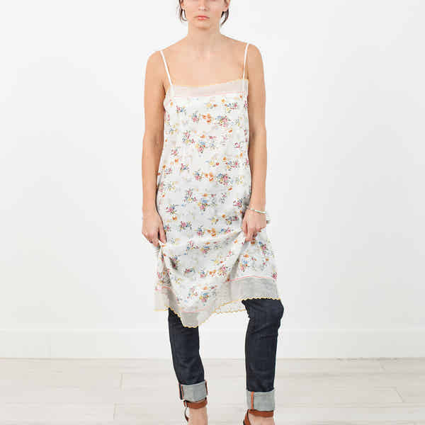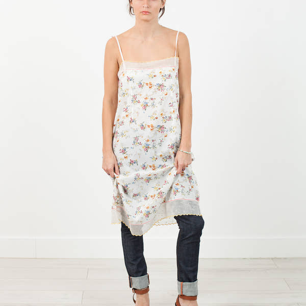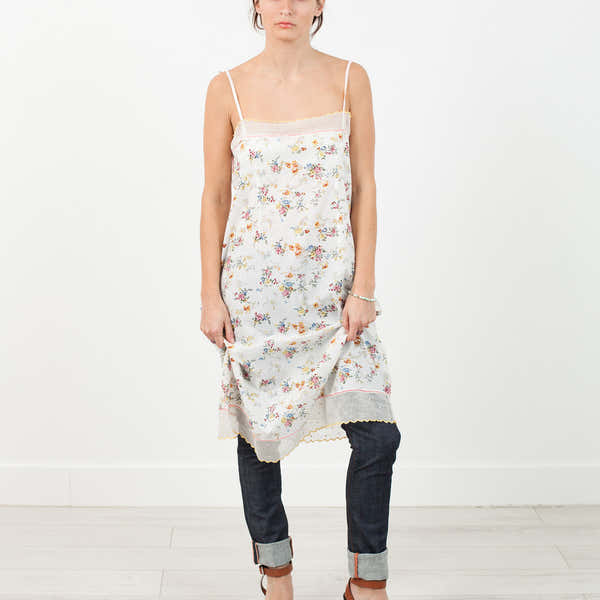 This dress provides just enough color to hint warmer temperatures while remaining universally seasonless. Beautifully printed flora throughout. Completely handmade, stitched, and embroidered. A natural, loose silhouette. Slim straps, and hits just below the knee in length. Sweet ruffled hem. Pero. Color Floral. 100% Cotton. Made in India. Lana is wearing a size 36.