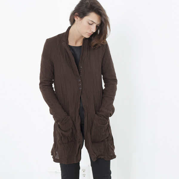 This cardigan-style woven wool blazer is rumpled and crumpled so that you don't have to sit up straight. A fitted body and sleeve includes patch pockets and a center back vent. Hazel Brown. Color Brown. 100% Wool.