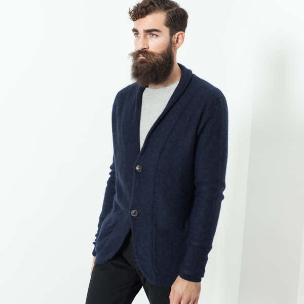 A grunge-inspired cardigan is backed up by a rich tactile experience in mohair and cotton. A subtle rounded hem and two patch pockets. Mauro Grifoni. Color Blue. 50% Cotton, 25% Mohair, 15% Nylon, 10% Wool. Made in Italy. Addis is wearing an Italian 52. Addis is 6’2”, Chest 38.5”, Waist 31”, Inseam 32”.