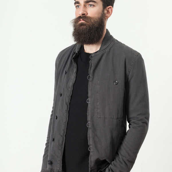 Understated yet classic, Hannes Roether’s pieces offer versatility through timeless silhouette. Woven jacket with unfinished hems. Standing collar. Hidden interior breast pocket. Fully lined. Color Tar. 100% Cotton. Made in Czech Republic. Addis is wearing a size Medium. Addis is 6’2”, Chest 38.5”, Waist 31”, Inseam 32”