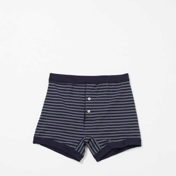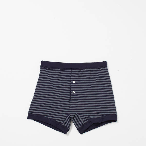 This prewashed cotton trunk is composed of the finest gauge for the softest materials. Offers stretch and softness in wear. Elastic waistband for ease. Etiquette. Color Navy/Grey. 95% Cotton, 5% Elastane. Made in Italy.