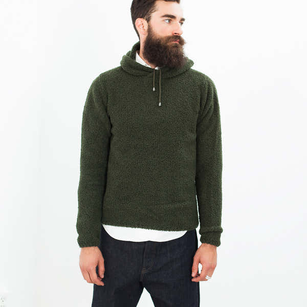 A nubbly and stretchy hooded sweatshirt with a subtle pull at the waist to keep in the warmth. Hematite drawcords. Esemplare. Color Greenfinch. 57% Virgin Wool, 26% Wool, 17% Polyamide. Addis is wearing a size Large. Addis is 6’2”, Chest 38.5”, Waist 31”, Inseam 32”.