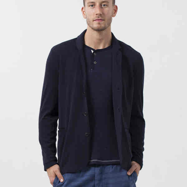Amiable texture for the pleasure seeking. Plenty of stretch with the coolness of summer. Four button closure at front. Two exterior pockets, one interior. Homecore. Color Navy. 90% Cotton, 10% Elastane. Made in Portugal.  Matt is wearing a Large. Matt is 6’2”, Chest 38”, Waist 31”, Inseam 34.5”.