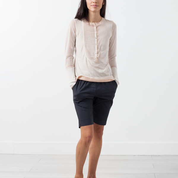 The Half Bib is excellent as the statement piece or in layering. Contrast cuff with sheer sleeves. Button placket at front with half bib. Kristensen du Nord. Color Powder. 100% Cotton. Made in Italy. Ashley is wearing a Size 1.
