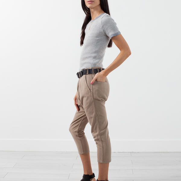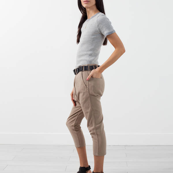 The Harem Chino from NLST is just the right amount of casual to offbeat. Side angled pockets at front with single coin pocket, two exterior pockets at back. Button fly closure at front. Color Khaki. 100% Cotton.