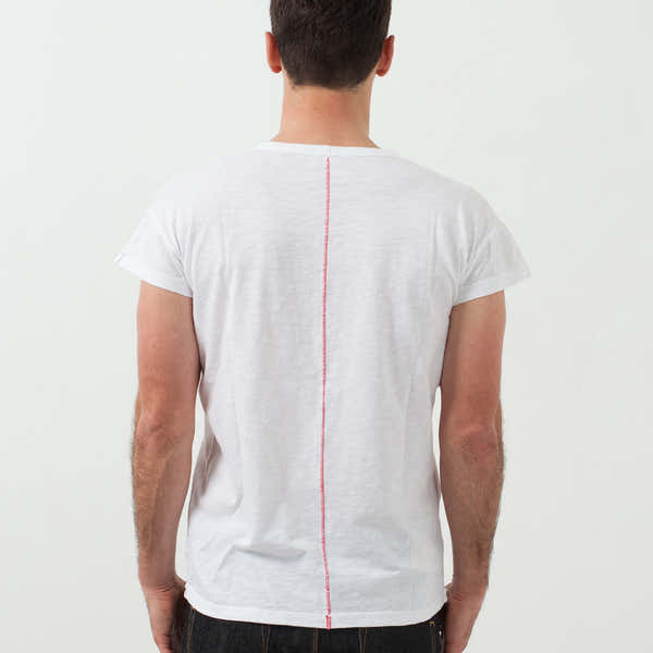 Homecore's Hibi is the t-shirt of your dreams. Incredibly soft cotton in a classic style makes everyday casual Friday. Exposed seam down back. Color White. 100% Cotton. Made in Portugal. Jacob is wearing a Medium.