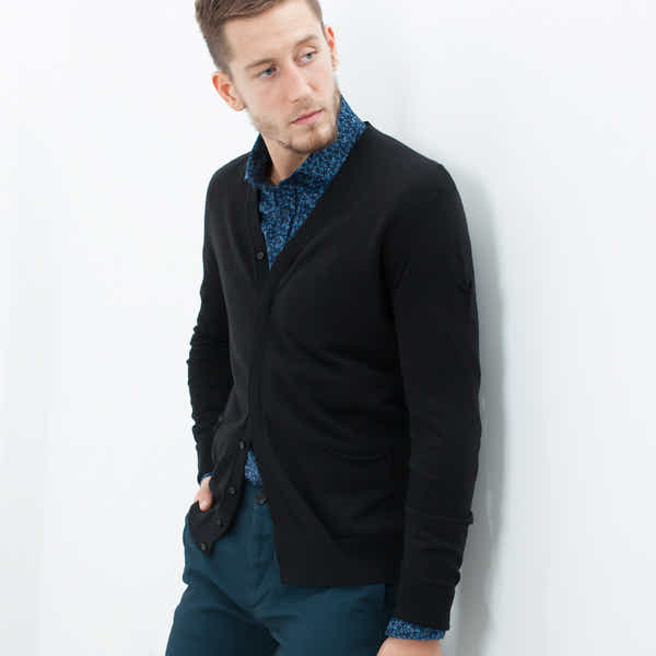 A merino wool cardigan in classic shape and length. A hidden button placket creates a clean line and the two patch pockets have a refined curl to the knit edge. Isabel Benenato. Color Black. 100% Extrafine Merino Wool. Matt is wearing a size Medium. Matt is 6’2”, Chest 38”, Waist 31”, Inseam 34.5”.