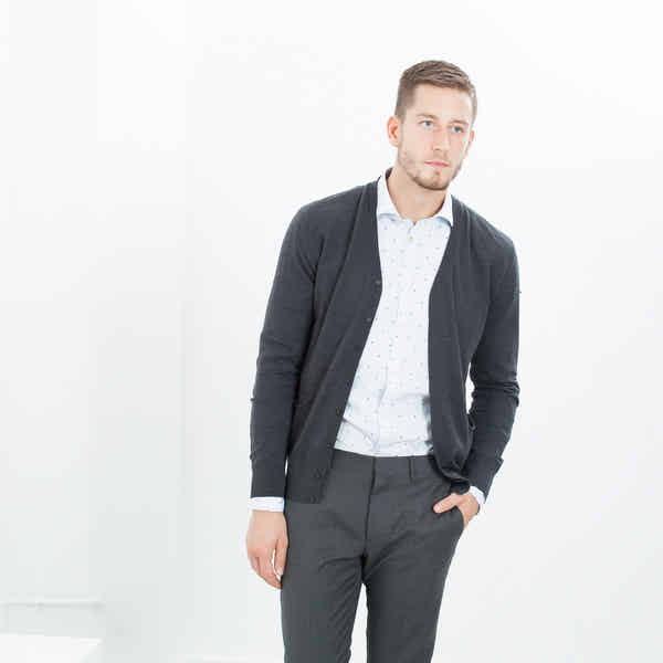 A merino wool cardigan in classic shape and length. A hidden button placket creates a clean line and the two patch pockets have a refined curl to the knit edge. Isabel Benenato. Color Charcoal. 100% Extrafine Merino Wool. Matt is wearing a size Medium. Matt is 6’2”, Chest 38”, Waist 31”, Inseam 34.5”.
