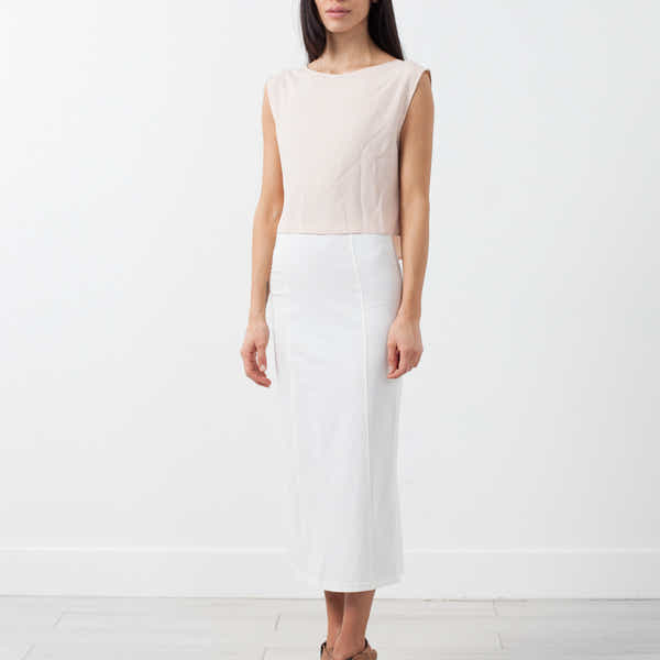 The High Skirt is a slim fit, yet comfortable for every occasion wear. Pencil-like silhouette equates a flattering look. We dare you to wear with anything. Elastic waistband for ease. Ivan Grundahl. Color Off White. 95% Cotton, 5% Elastane. Made in Portugal. Ashley is wearing a Small.