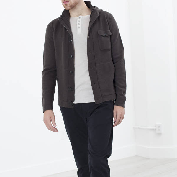 A warm hooded sweater jacket with zip and button closure. A front breast pocket and side angled pockets for your hands. Esemplare. Color Dark Green. 100% Wool. Spencer is wearing a size Large.