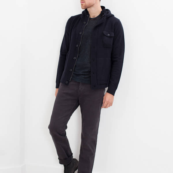 A warm hooded sweater jacket with zip and button closure. A front breast pocket and side angled pockets for your hands. Esemplare. Color Navy. 100% Wool. Spencer is wearing a size Large.