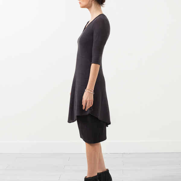 Spring's go-to staple is the knit sweater dress. The Hubsi offers a soft v-neckline, 3/4 sleeves, and a shapely silhouette. Hannes Roether. Color Phantom. 75% Cotton, 25% Linen. Made in Germany. Lana is wearing an X-Small.