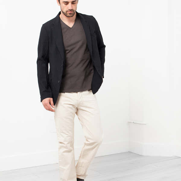 The Sharp Blazer finishes cleanly with stretch in the body. Two button closure at front. Lining. Three exterior pockets at front. Sage de Cret. Color Black. 100% Polyester. Made in Japan. Jacob is wearing a Large.