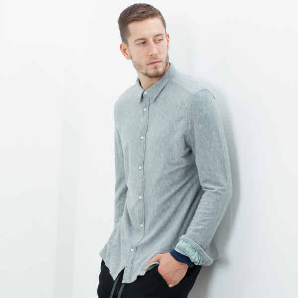 V:Room takes the classic button up and plays it casual by giving it a contrasting fabric inside. Curved hem with side splits. Color Blue/Grey. 100% Cotton. Matt is wearing a size Large. Matt is 6’2”, Chest 38”, Waist 31”, Inseam 34.5”.