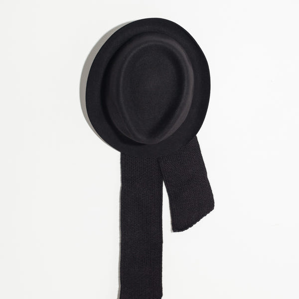 Internationally acclaimed hat designer, Fiona Bennett, offers superior-made headwear of fur felt and Alpaca wool through her new label, Kiss by Fiona Bennett. Sleek, classic, and comfortable, her pieces are crafted to age well while offering relevant statements. The Kate Hat with attached scarf gives the two in one. Color Black. 100% Fur Felt, 100% Alpaca Wool. Made in Berlin.