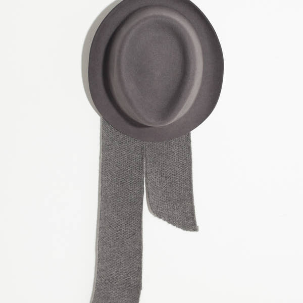 Internationally acclaimed hat designer, Fiona Bennett, offers superior-made headwear of fur felt and Alpaca wool through her new label, Kiss by Fiona Bennett. Sleek, classic, and comfortable, her pieces are crafted to age well while offering relevant statements. The Kate Hat with attached scarf gives the two in one. Color Steel Grey. 100% Fur Felt, 100% Alpaca Wool. Made in Berlin.