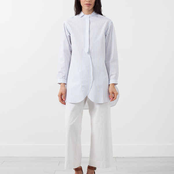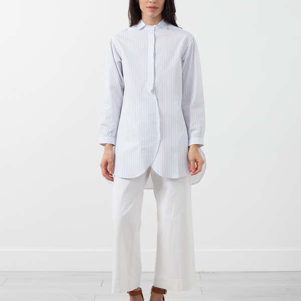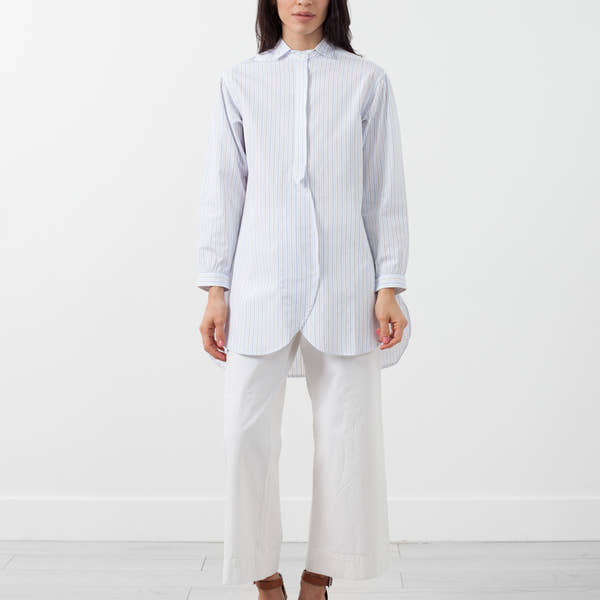 The Kate Tunic with its' eye-catching details is an inclusive piece. Combining classic details with bohemian flourish. Front button placket, standard sleeves, and a layered hem. Yoshi Kondo. Color White. 100% Cotton. Made in Romania. Ashley is wearing a Small.
