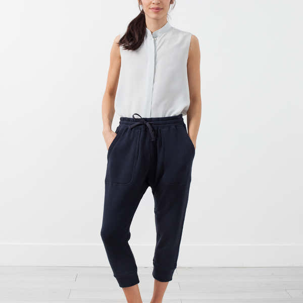 The Knit Harem is just the right amount of casual to offbeat comfort. Side angled pockets at front, two exterior pockets at back. Drawstring waistband for ease. NLST. Color Navy. 100% Cotton. Ashley is wearing an X-Small.