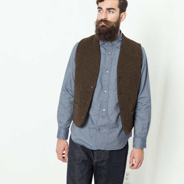 Stylish in a thick boiled wool this four button vest from Homecore has a full cotton lining with tiered interior pockets waiting to hold your belongings close to your heart. Homecore. Color Brown. 100% Wool. 100% Cotton Lining. Addis is wearing a size Large. Addis is 6’2”, Chest 38.5”, Waist 31”, Inseam 32”.
