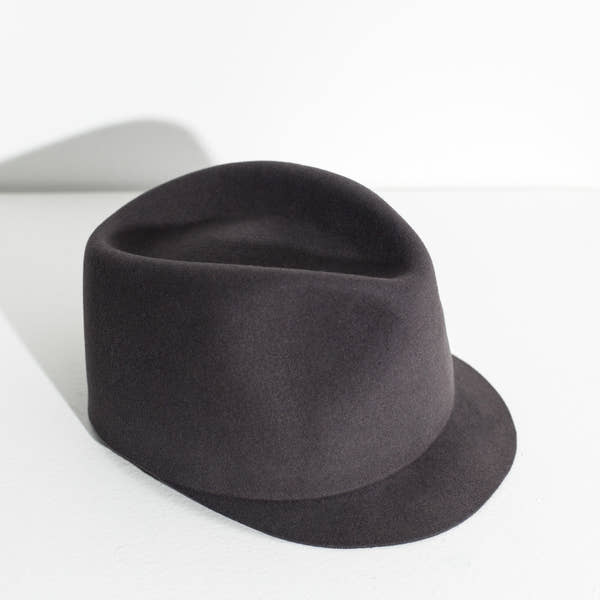 Internationally acclaimed hat designer, Fiona Bennett, offers superior-made headwear of fur felt and Alpaca wool through her new label, Kiss by Fiona Bennett. Sleek, classic, and comfortable, her pieces are crafted to age well while offering relevant statements. The single piece Kraig Hat is an excellent addition to one's winter collection. Color Steel Grey. 100% Fur Felt. Made in Berlin.