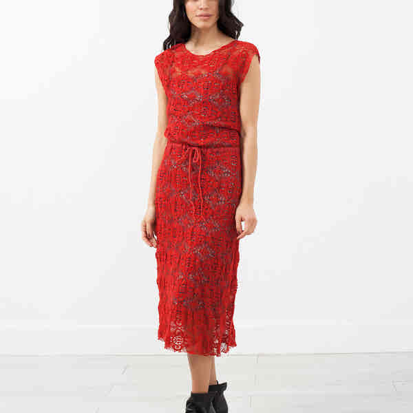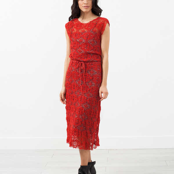 The Lace Dress channel a bohemian flourish in the classiest way. Drawstring waist tie. Diamond print slip underneath. Capped sleeves. Scoop neckline. Hazel Brown. Color Red. 100% Cotton. Slip 100% Silk. Made in U.S.A. Ashley is wearing a Size 1.