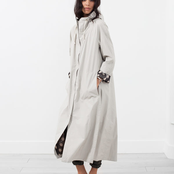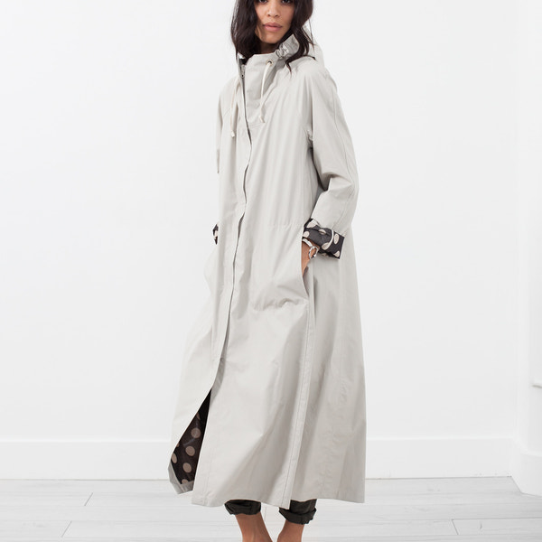 The Lale Coat offers to the ankle coverage with a water resistance finish. Perfected for spring showers. Drawstring at hood and waist. Full, covered zip closure at front. Side angled pockets at front with interior zip access. Annette Gortz. Color Cream. 78% Cotton, 22% Silk, Coating 100% Polyurethane. Made in the EU. Ashley is wearing a Small.