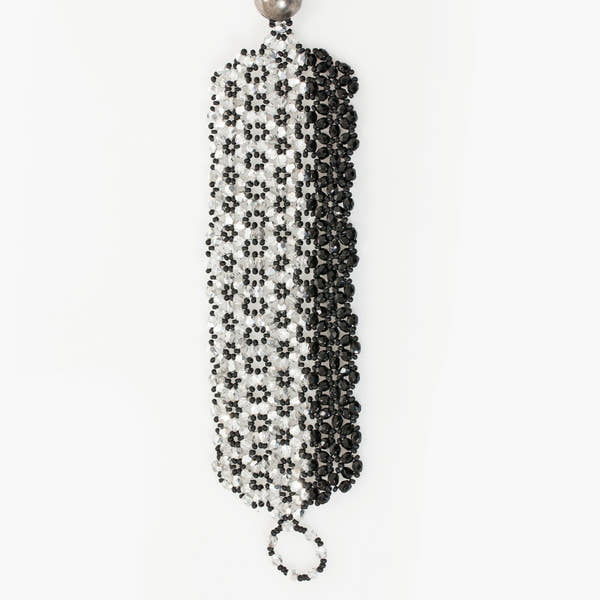 Rows of mixed beads fall into a flower pattern in this wide cuff from Maria Calderara. Color Silver/Black. Bead to Ring Length 6 & 3/4", 2 & 1/4" Wide.