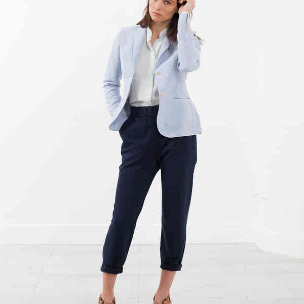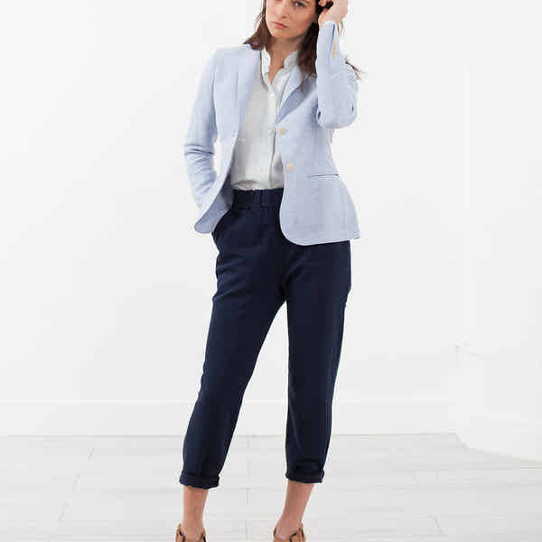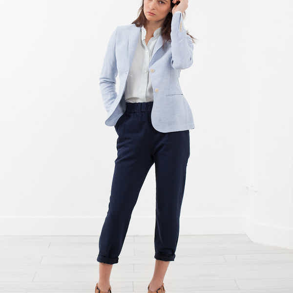 The Lavanda Blazer is an excellent springtime basic with its trim silhouette and soft color scheme. Two button placket closure at front. Two exterior pockets at front. Lining. Lardini. Color Blue. 38% Flax, 32% Viscose, 30% Cotton, Lining 70% Acetate, 30% P.B. Elite. Made in Italy. Lana is wearing the Italian 38.