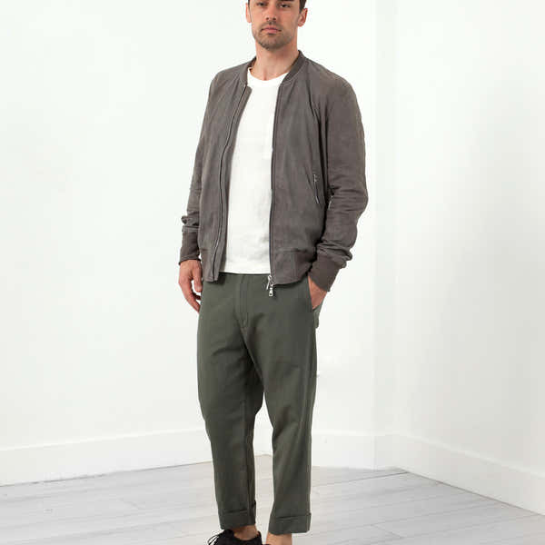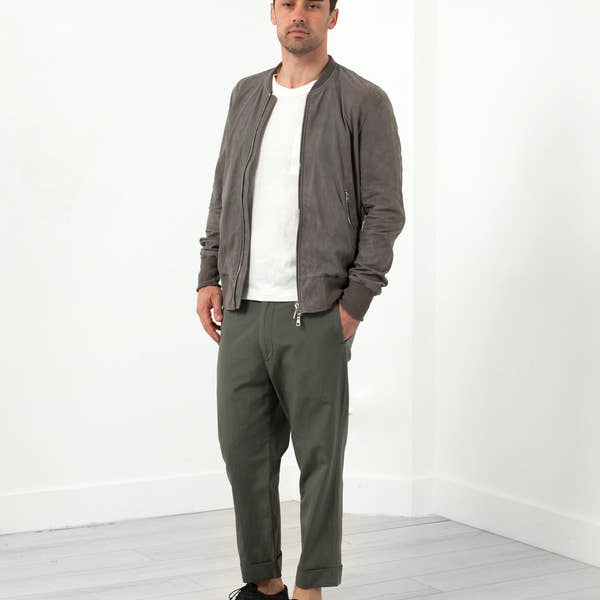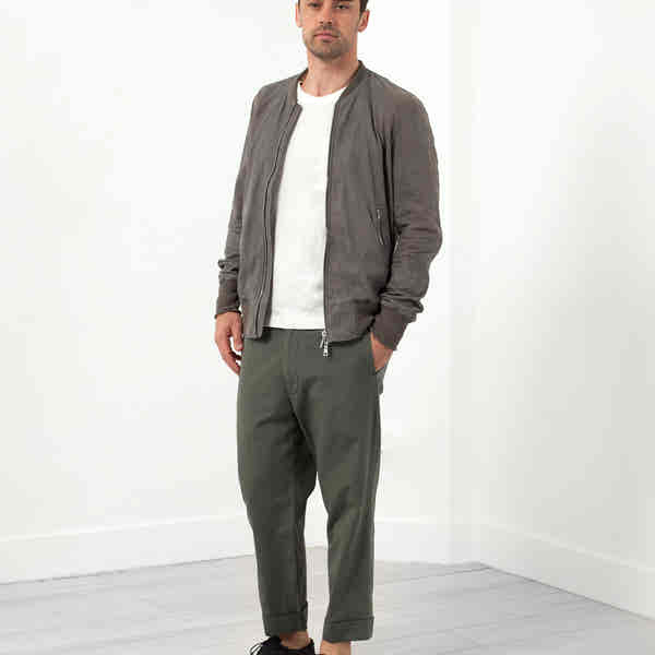 Giorgio Brato is the master of all things leather. With excellence in every touch, his collections are not only deservedly lasting, but beyond stylish. These pieces will transcend, forever. The Leather Bomber Jacket is an understated cool. Meant to last the wear and tear life brings. Color Dust. 100% Leather, 100% Linen. Made in Italy. Jacob is wearing an Italian 50.