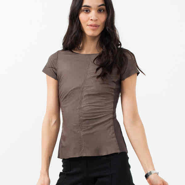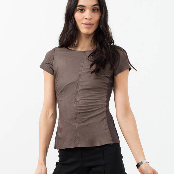 The Leather T is an industrious piece with its unfinished hems and sueded leather. Constructed of contrasting panels, the T is a flattering fit and shapely. Scoop neckline. Capped sleeves. Hazel Brown. Color Grey. 100% Pigsuede, 2nd Fabric 100% Cotton. Ashley is wearing the size 1.
