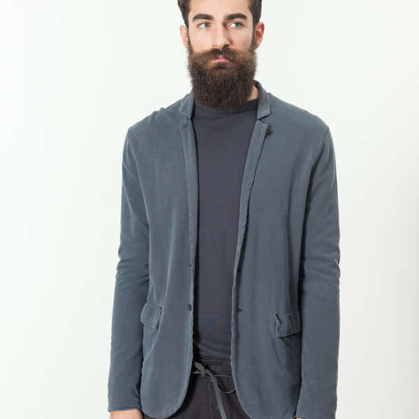 Understated yet classic, Hannes Roether’s pieces offer versatility through timeless silhouette. Knit blazer with side paneling, soft lapels, and front pockets. Grey. 100% Cotton. Made in Portugal. Addis is wearing a size Small. Addis is 6’2”, Chest 38.5”, Waist 31”, Inseam 32”.
