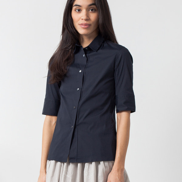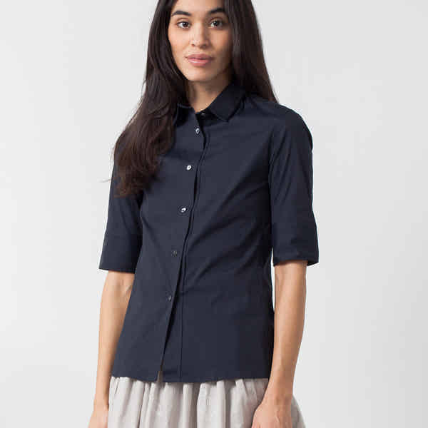 The Lena by Lareida indulges the classicism of excellent tailoring but made specifically for women. Offers a natural fit, front button placket, and tailored collar and cuffs. Color Navy. 78% Cotton, 18% Polyamide, 4% Elastane. Made in Portugal. Ashley is wearing a 36.