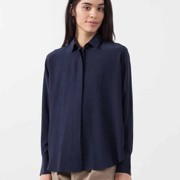 The perfect blouse is a coveted thing. The German brand has devoted itself to harnessing the mastery and construction of this timeless piece. The graceful Lima adds stunning embellishment to the springtime closet. Essentially frameless, this top incarnates the feminine mystique. Hidden front button placket. Lareida. Color Navy. 100% Silk. Made in Portugal. Ashley is wearing a Size 34.