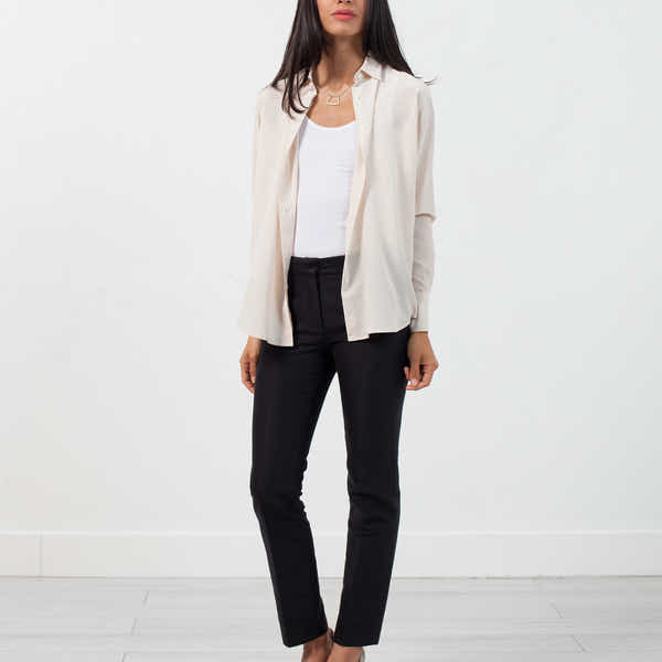 The graceful Lima adds stunning embellishment to the springtime closet. Essentially frameless, this top incarnates the feminine mystique. Hidden front button placket. Lareida. Color Blush. 100% Silk. Made in Portugal. Ashley is wearing a 34.