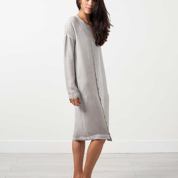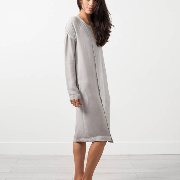 The Long Sleeve Silk Dress presents us with our tunic fit. With a loose silhouette paired with long sleeves and embroidered details, we drift into a daydreaming. Kristensen du Nord. Color Dust. 100% Silk. Made in Italy. Ashley is wearing a Size 0.