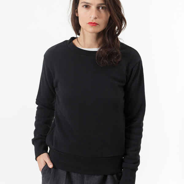 A substantial crew neck sweatshirt from Japanese company AR SRPLS who are know for their military with a twist collections. A closed silver zip runs the length of the center back. Color Black. 100% Cotton. Lana is wearing a size Small.