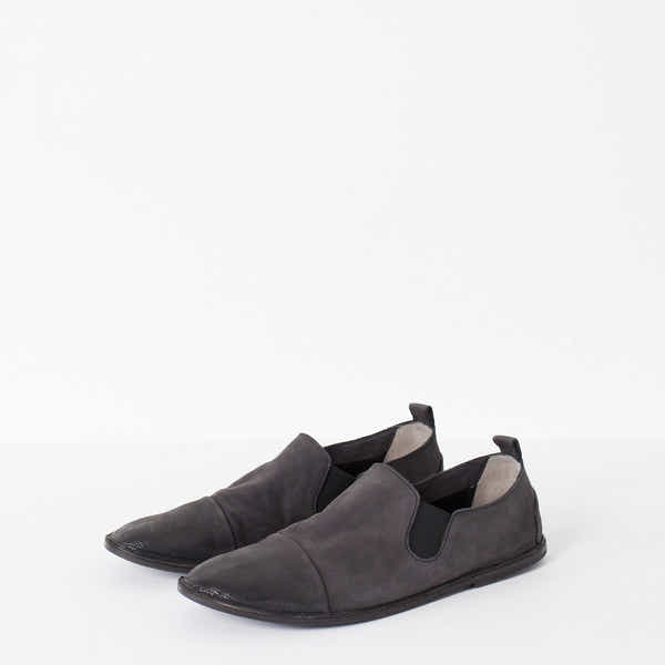 Married aesthetics of innovation and tradition, Marséll crafts shoes of mastering technique. Where modern classism takes wearable shape, anticipate artistic expression epitomized in leather footwear. The Low Chelsea Boot nods to the classic staple yet takes it's own personality. With sueded leather, and a rounded toe, this piece will aged courageously. Color Black. 100% Leather. Made in Italy.