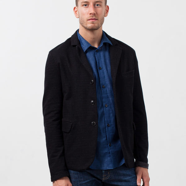 The Marl Jacket presents the structure of a suit jacket with the comfort of your favorite sweater. Three exterior pockets, three interior pockets. Homecore. Lining. Color Grey. 77% Cotton, 19% Polyester, 4% Elastane. Made in Portugal. Matt is 6'2 and wears a Medium. Product fits true to size.