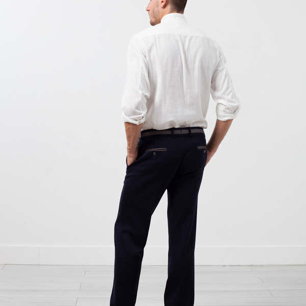 The McKile Trouser's brilliance is all in the details. Single button closure with zip fly at front. Four exterior pockets at front. Circle of Gentlemen. Color Navy. 92% Cotton, 8% Polyamide. Made in Portugal. Matt is wearing a size Medium. Matt is 6’2”, Chest 38”, Waist 31”, Inseam 34.5”.