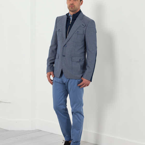 The Medwyn's brilliance is all in the details. Double button closure with interior zip. Four, button down exterior pockets at front. Fully Lined. Circle of Gentlemen. Color Blue. 100% Viscose, Lining 100% Viscose. Made in Portugal. Jacob is wearing a 50.