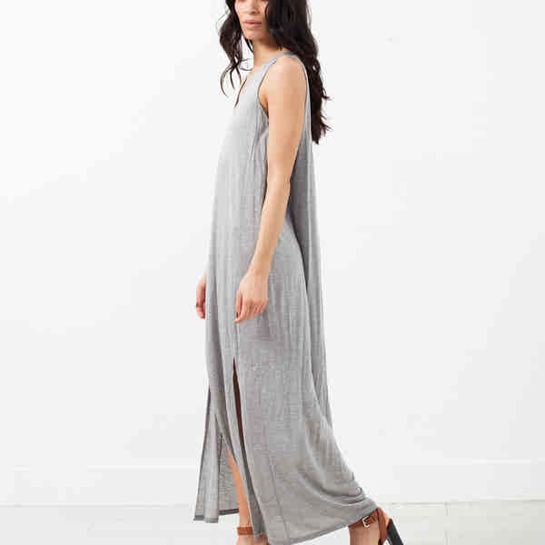 The Megara Dress gives a renewed sense of purpose to the well-loved maxi dress. Soft neckline in contrast to deep slits, this piece keeps things cool. Drifter. Color Heather Grey. 90% Model, 10% Silk. Made in U.S.A.