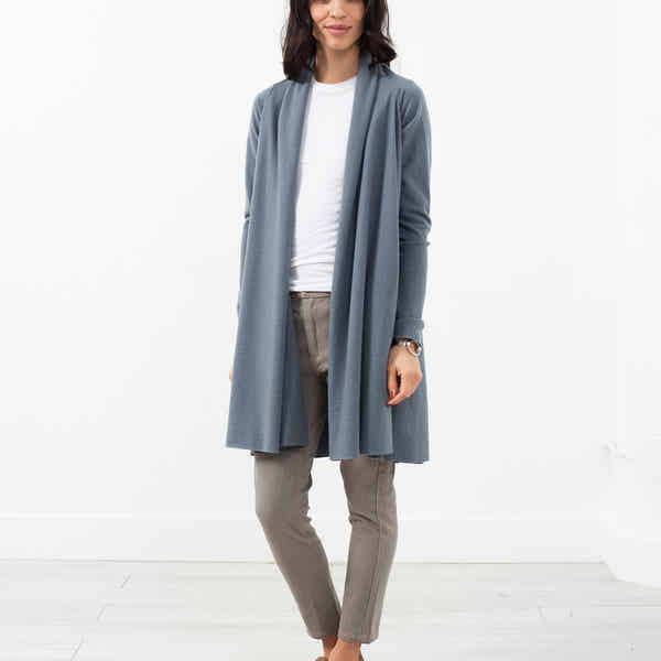 Hovman's Merino Jacket is not only highly wearable, but also seasonless. The lightweight merino wool offers perfect temperature with ease. Raw hems throughout. Length reaches mid thigh. Color Smoke. 100% Extra Fine Merino Wool. Ashley is wearing a Size 34.