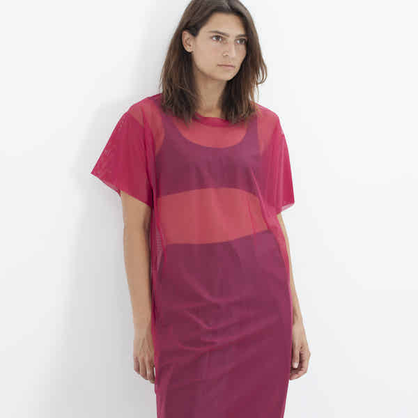 An edgy basic to layer over and under all of your current closet items. Bold and rectangular in shape the stiff material won't stretch out or lose it's shape. The dress falls just below the knee if wearing true to your size. Maria Calderara. Color Pink. 100% Polyamide. Lana is wearing a size 1.