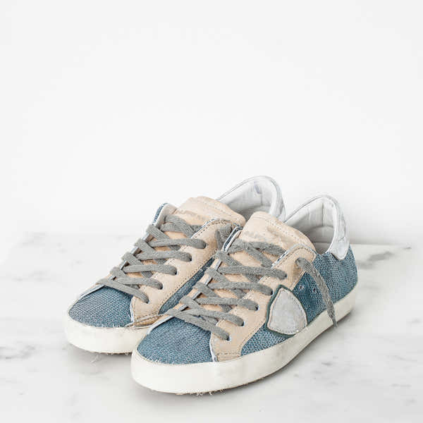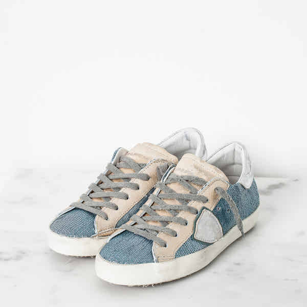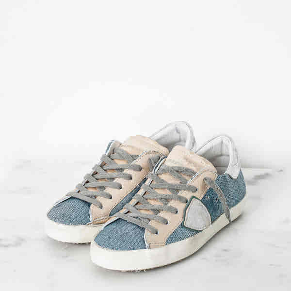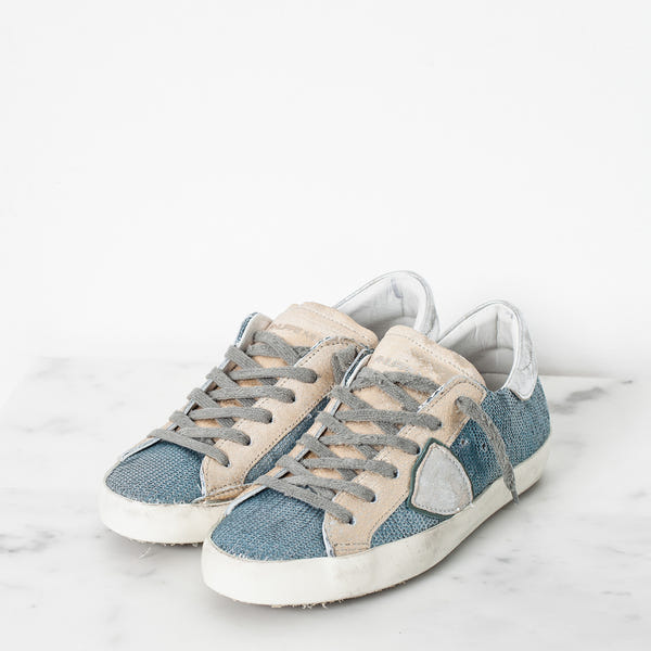 Looking for some casual sneaks for any day, any occasion wear? Philippe Model is your choice designer. Each shoe is handmade with washed leathers, the soles manually assembled, and leathers brushed, making every pair distinctive and imprinted with the craft of each shoemaker. Pair your evening wear with a Model sneaker for some spunk. Sparkle fun for everyone. Sequins throughout. Color Sky/Gold. Upper 100% Calf Leather, Sole 100% Rubber, Lining 100% Cotton. Made in Italy.