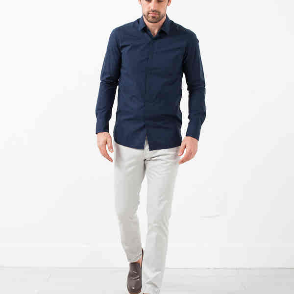 The Milano Shirt is classically tailored as the everyday button up shirt for both casual and more formal wear. Red embroidery cascades the center back seam as a nicely added detail. Covered button placket closure at front. Homecore. Color Navy. 100% Cotton. Made in Portugal. Jacob is wearing a Large.