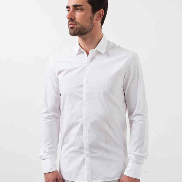 The Milano Shirt is classically tailored as the everyday button up shirt for both casual and more formal wear. Red embroidery cascades the center back seam as a nicely added detail. Covered button placket closure at front. Homecore. Color White. 100% Cotton. Made in Portugal. Jacob is wearing a Medium.