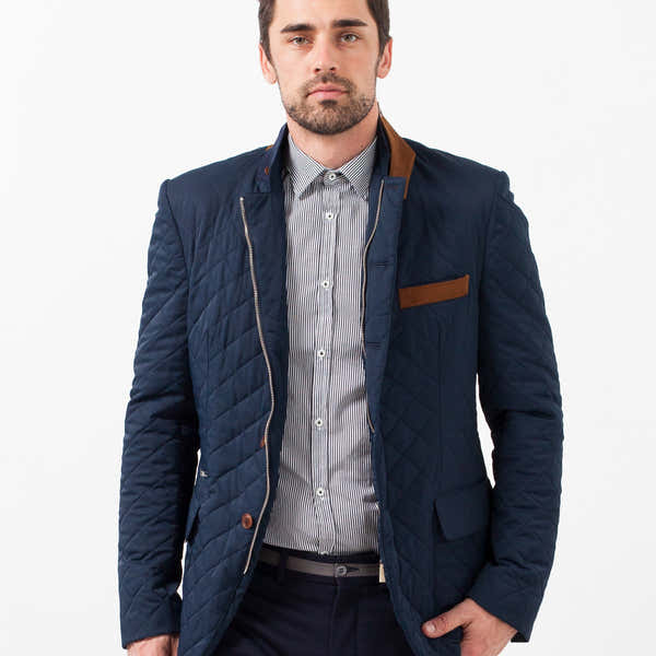 The Milton invites a lumberjack appeal for luxury men's suiting. Leather adjustable collar detail. Button placket closure with zip at front. Four exterior pockets at front. Fully lined. Circle of Gentlemen. Color Navy. 96% Polyamide, 4% Elastane, Lining 100% Viscose. Made in Portugal. Jacob is wearing a 48.