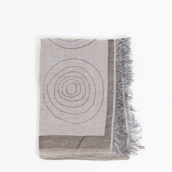 Where geometry meets fashion, the Spiral Scarf entices. Hand finished. Fringe accents. 1-100. Color Grey. 100% Cotton. Made in Italy. Length 33 X 32".